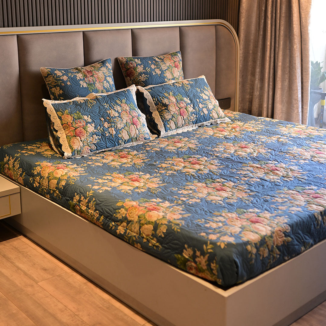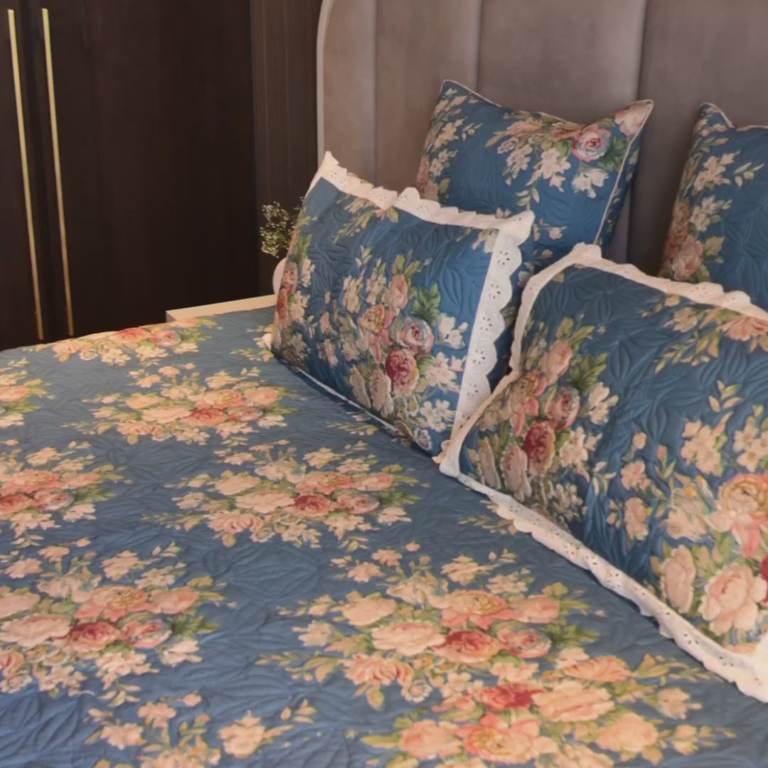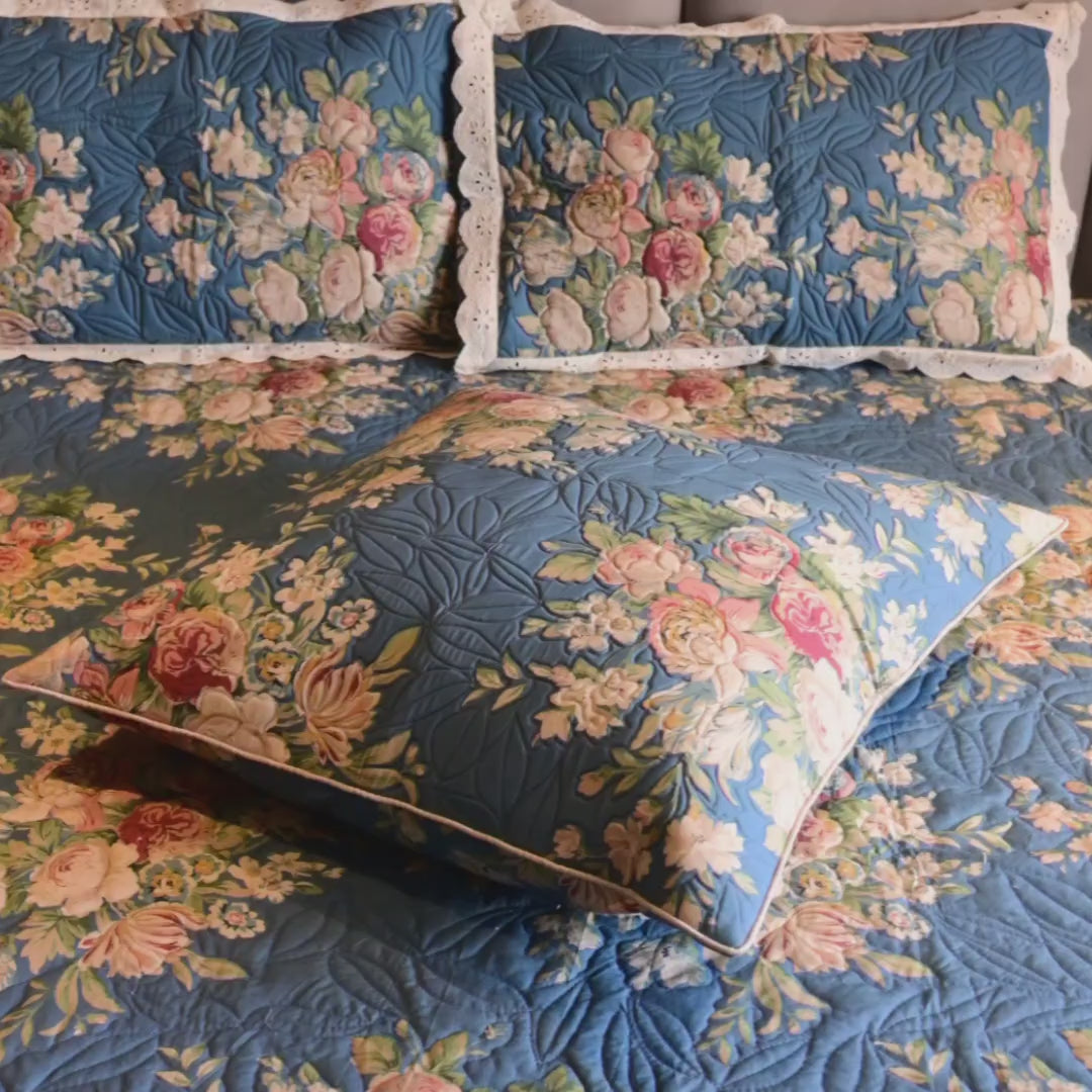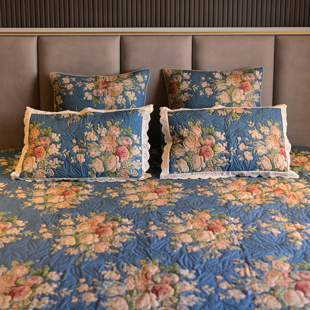 The gently quilted bedspread features an all-over vintage floral print set against a muted blue base, creating a sense of depth without overpowering the space. Delicate quilting enhances the texture, while subtle lace edging on the pillow covers adds a touch of vintage charm. Coordinated large cushion covers complete the look, lending a layered, well-curated feel that is both inviting and elegant.