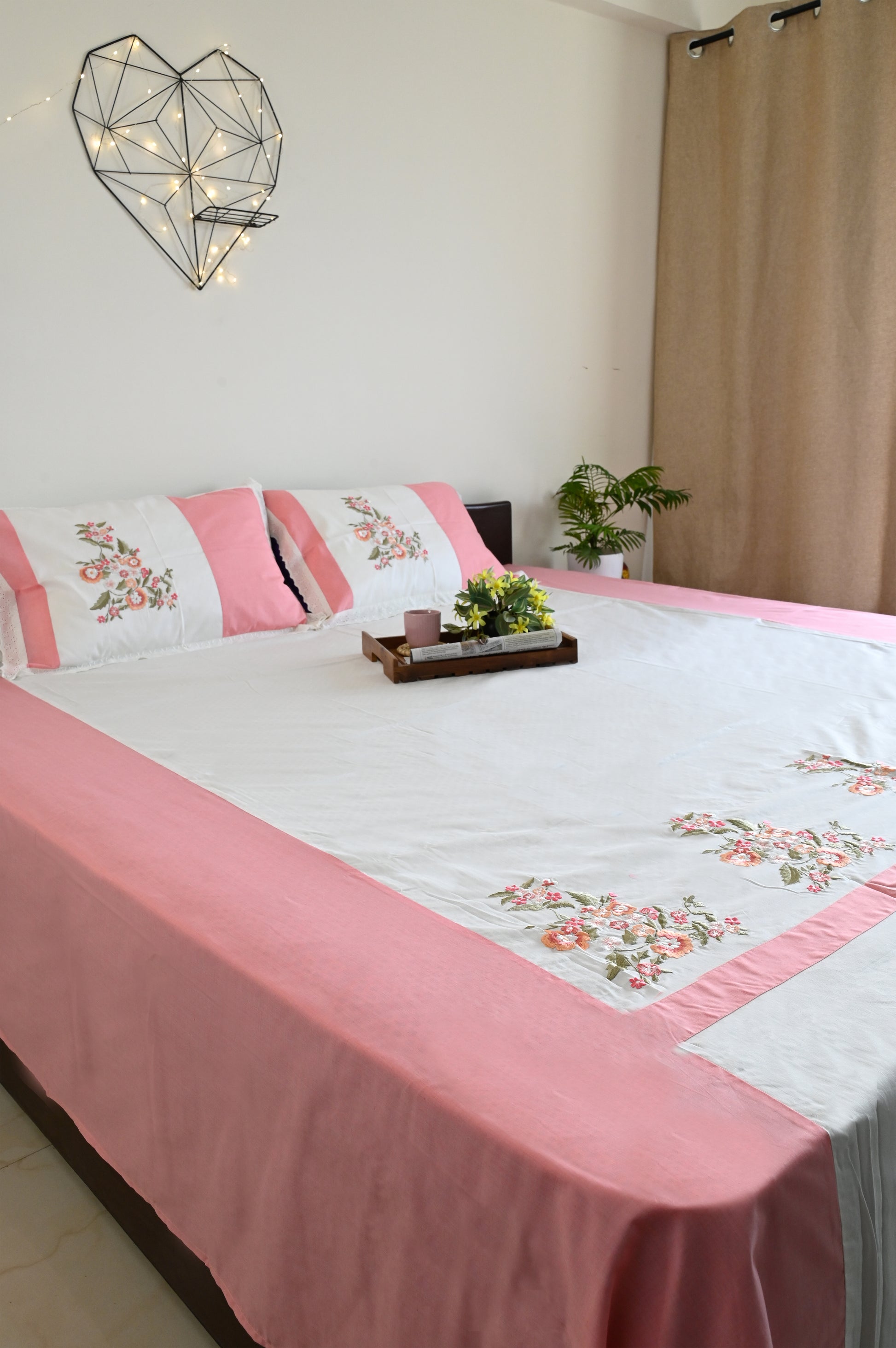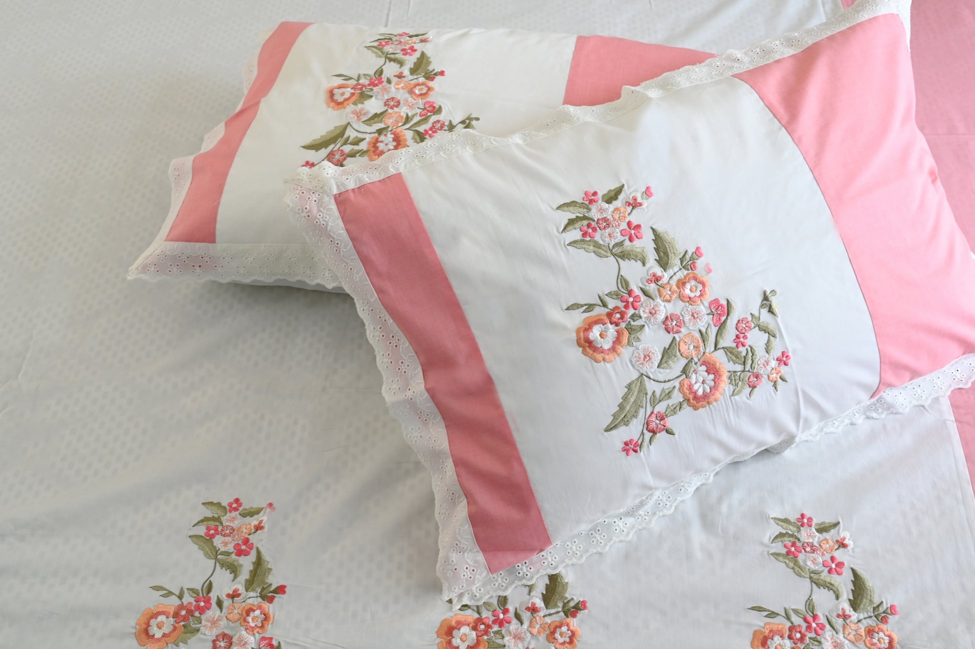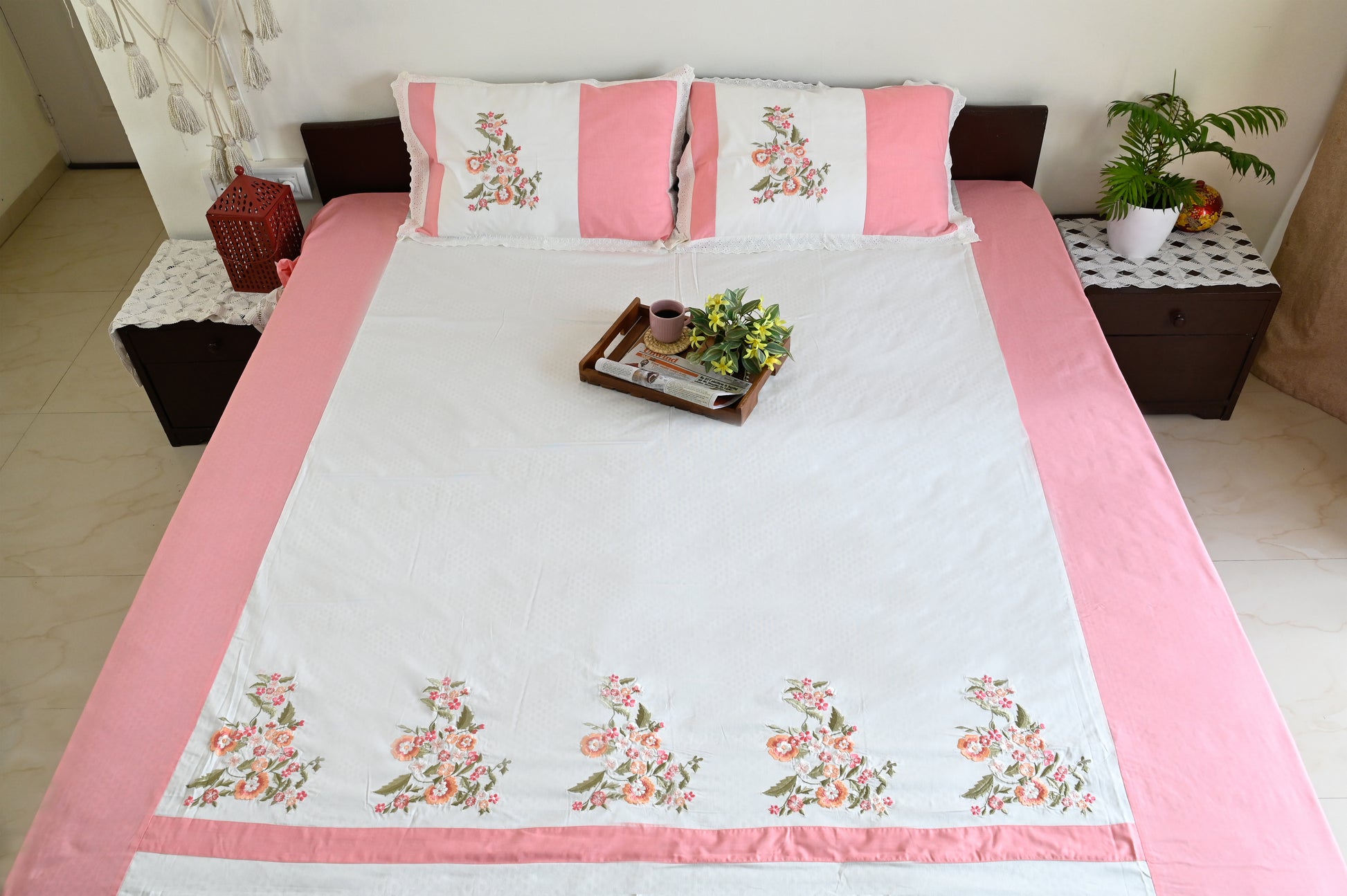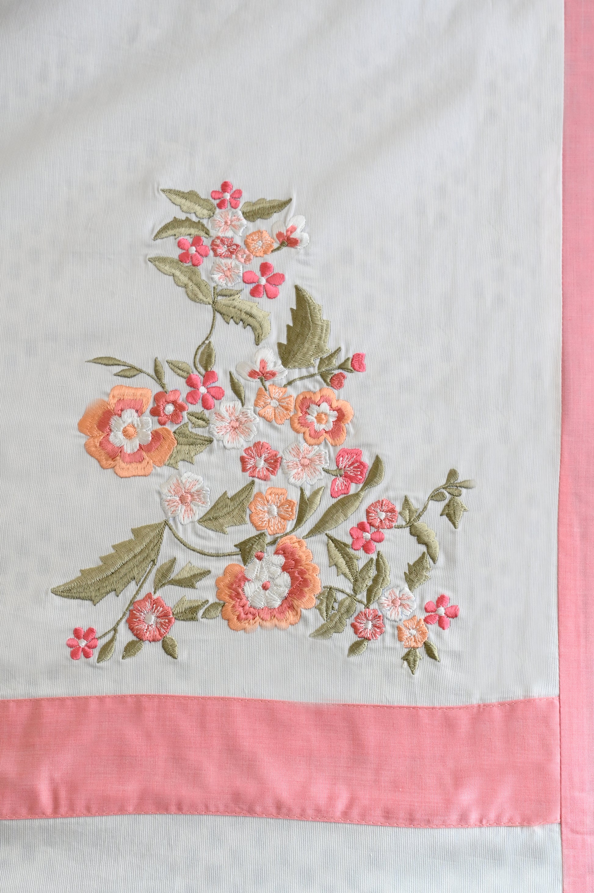 Soft white flows into gentle pink edges, where embroidered floral patterns bloom like a garden in spring. Crafted in Super King size with a high thread count, its breathable fabric ensures no shrinkage or color loss, making it as durable as it is elegant.