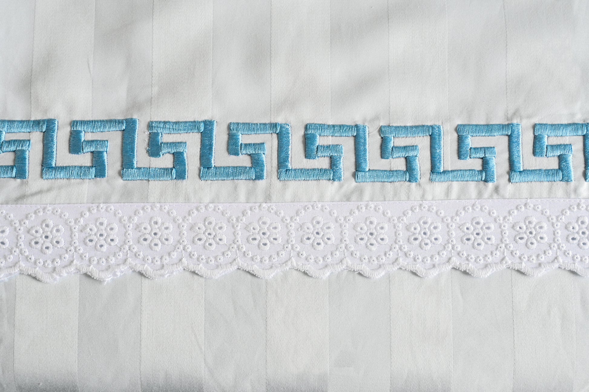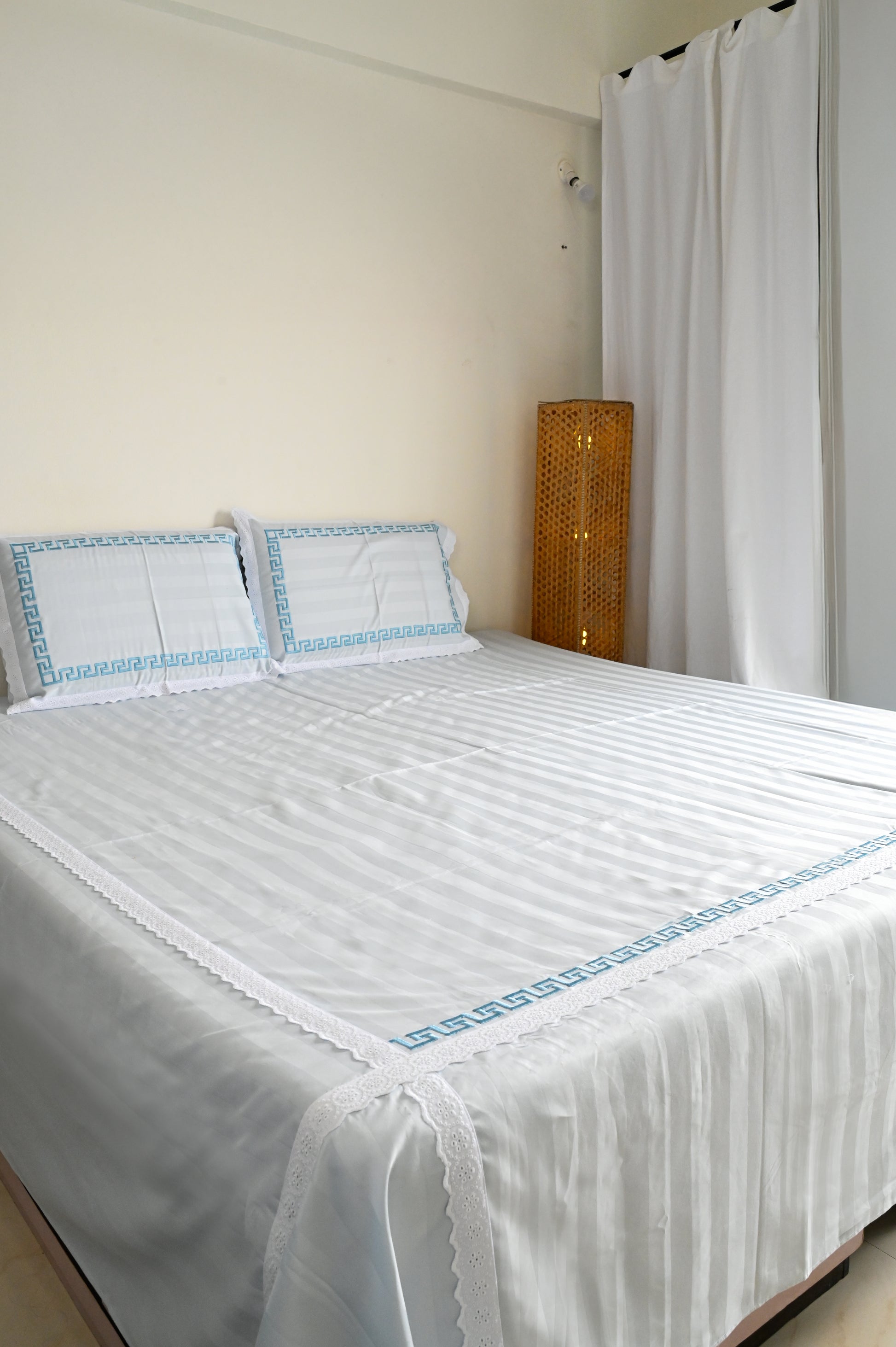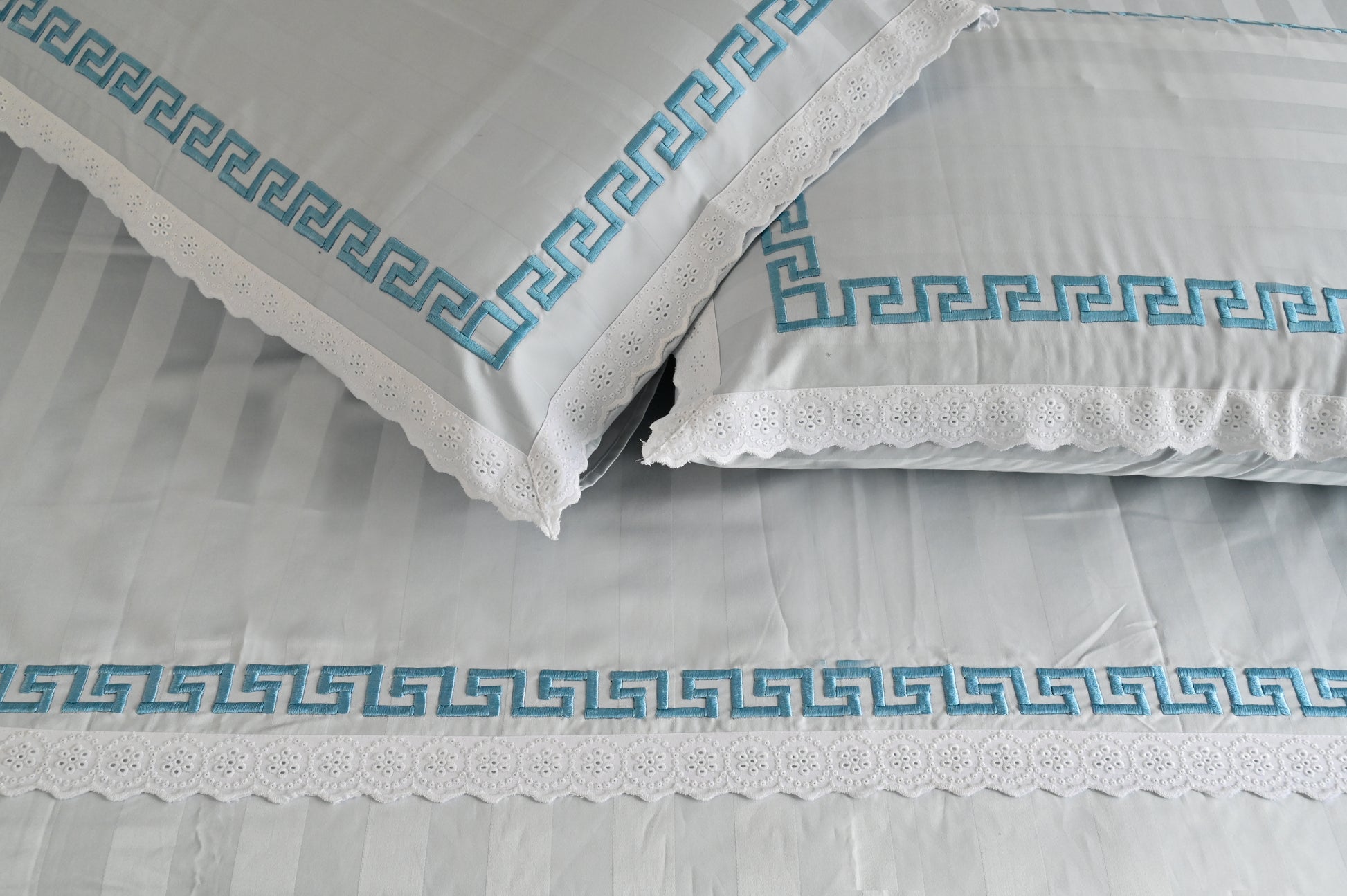 The crisp white bedsheet stands elegant, framed by light blue embroidery that feels as fresh as a cool breeze. Matching pillows rest beside it, embodying simplicity and charm.
