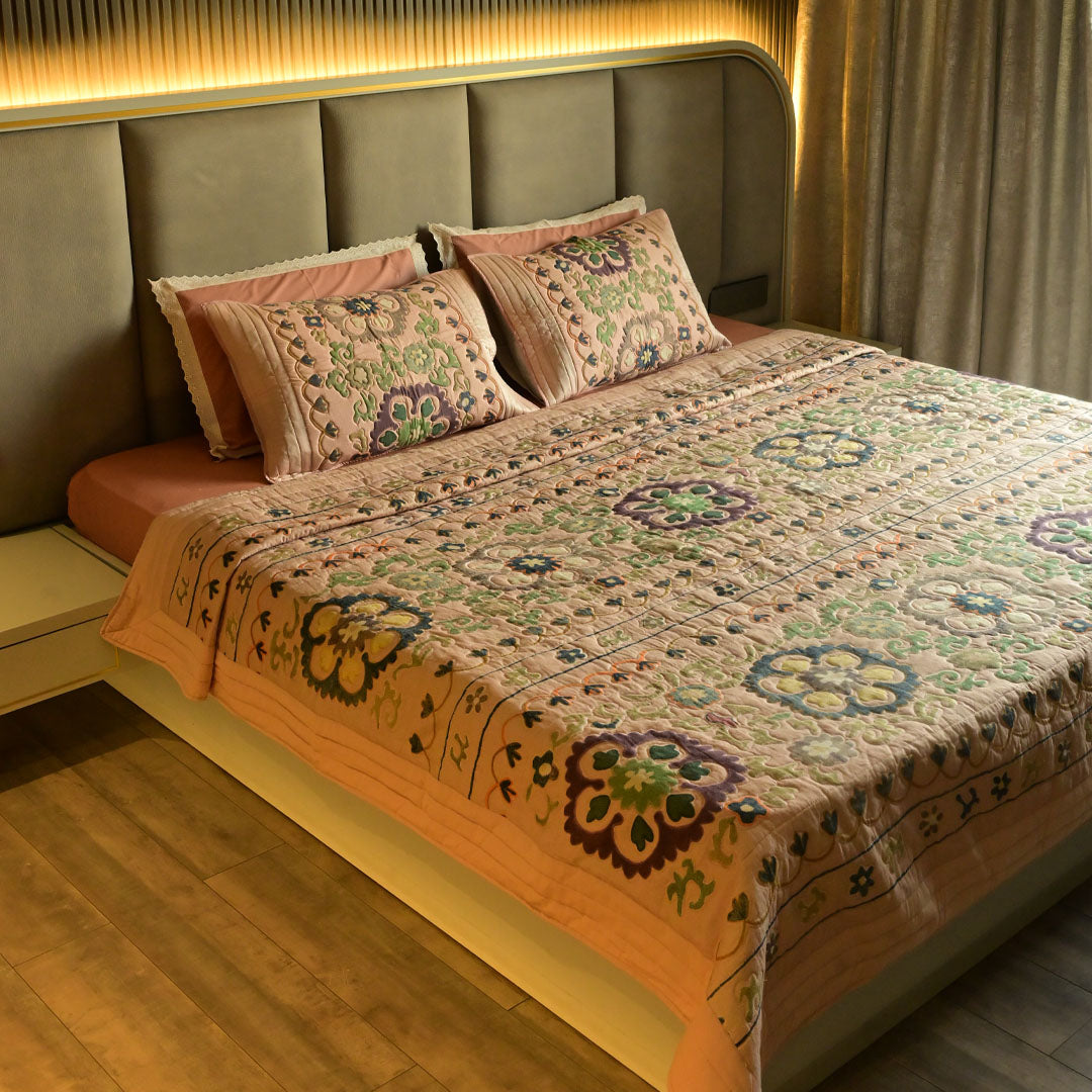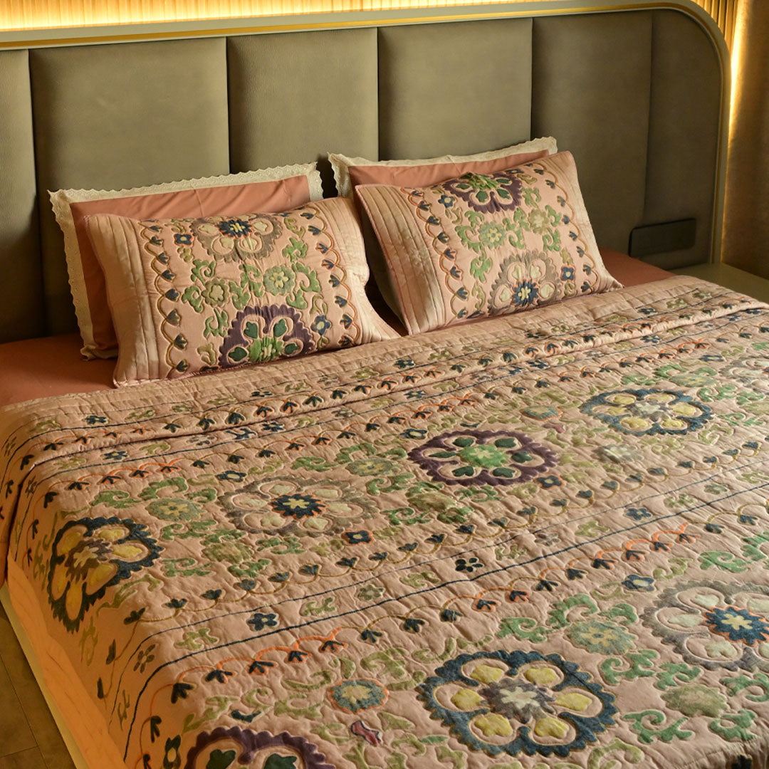 The quilted bedspread features detailed floral medallions in gentle multi-tonal hues set against a muted blush base, offering richness while maintaining a soothing palette. The layered stitching enhances the tactile appeal, while the pillow covers mirror the central design for continuity, creating a bedroom setting that feels thoughtfully styled and inviting.