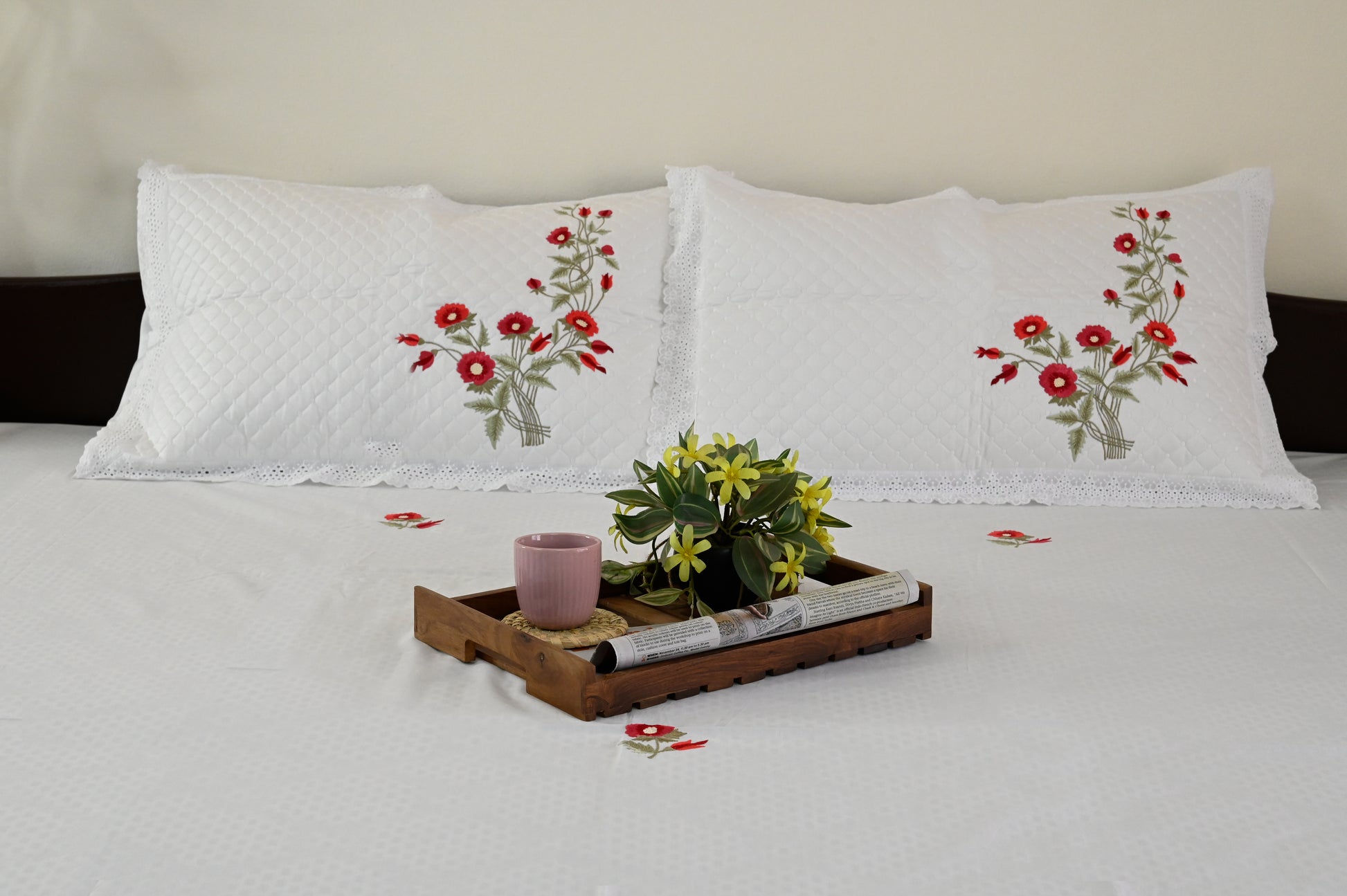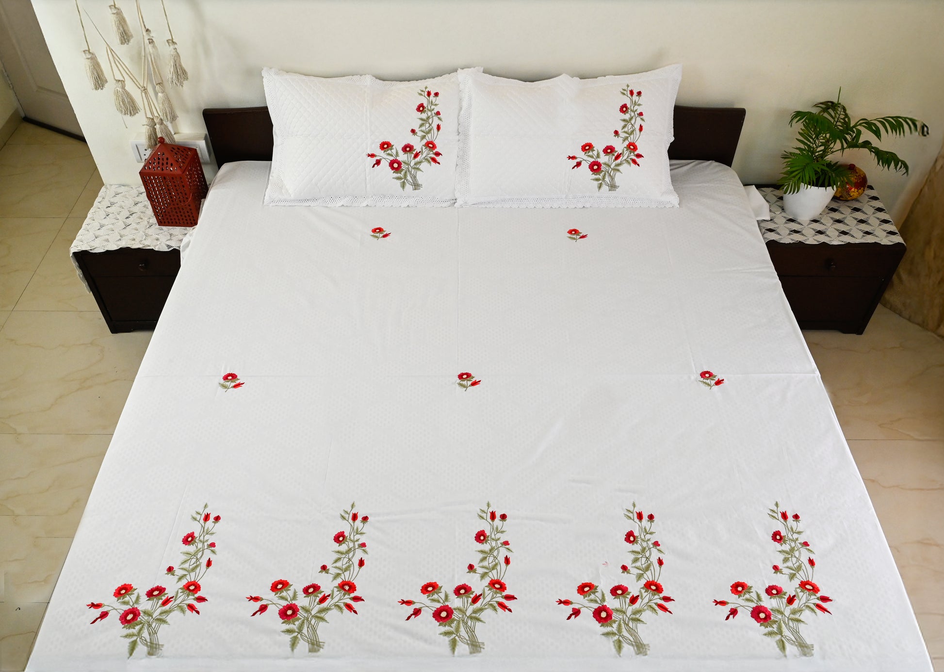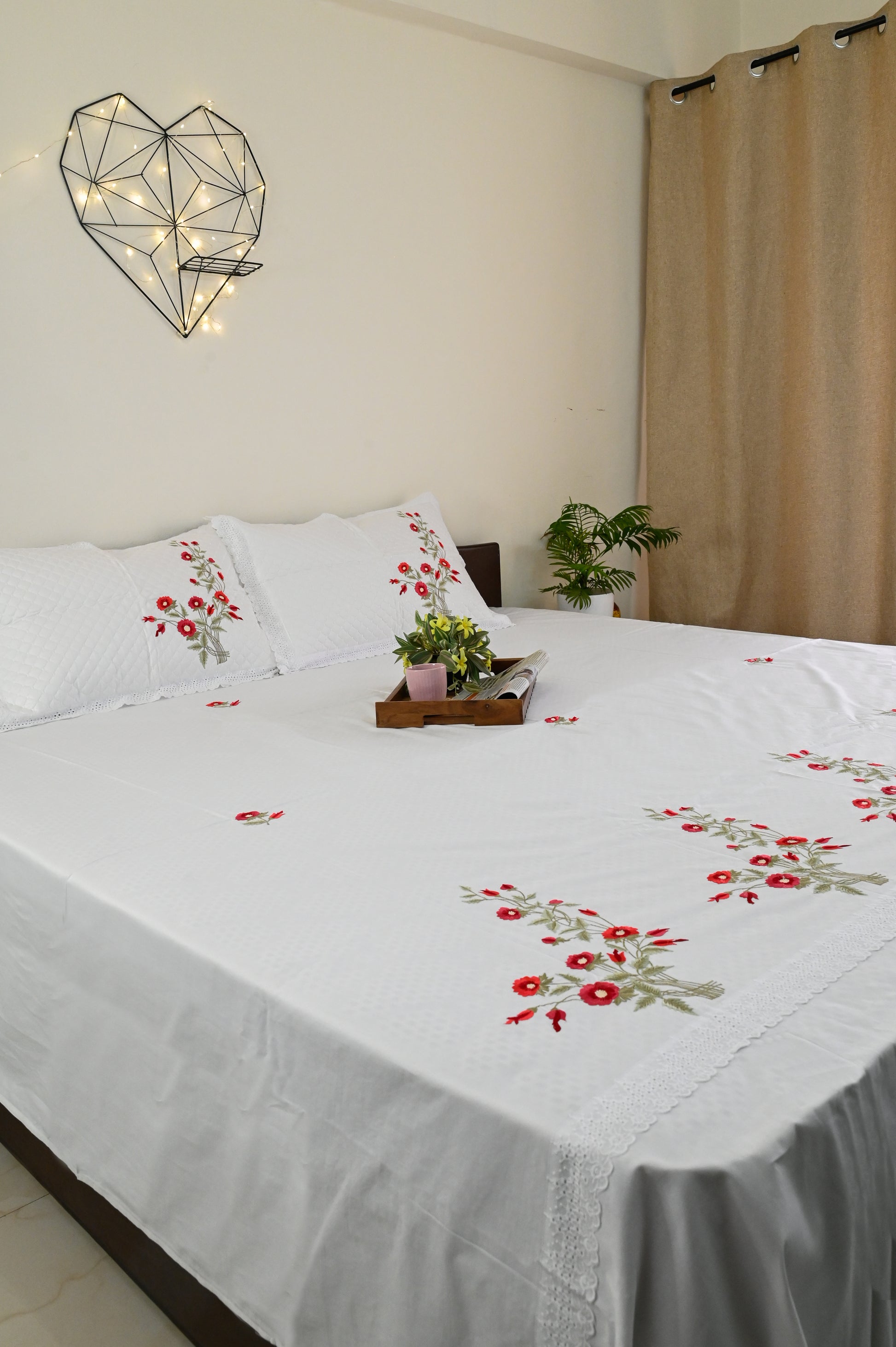 Indulge in the charm of this Super King-sized white bedsheet, featuring exquisite red and green floral embroidery. Crafted with high thread count for superior softness and durability, it’s a perfect addition to any elegant bedroom.