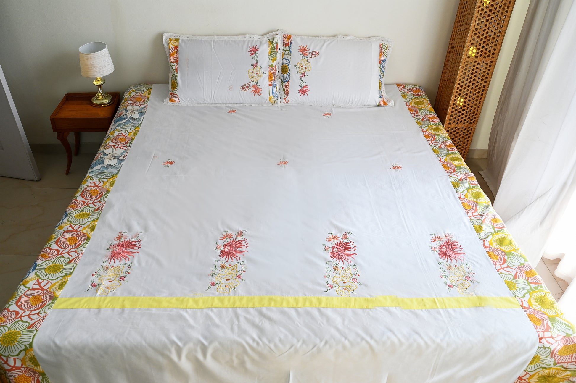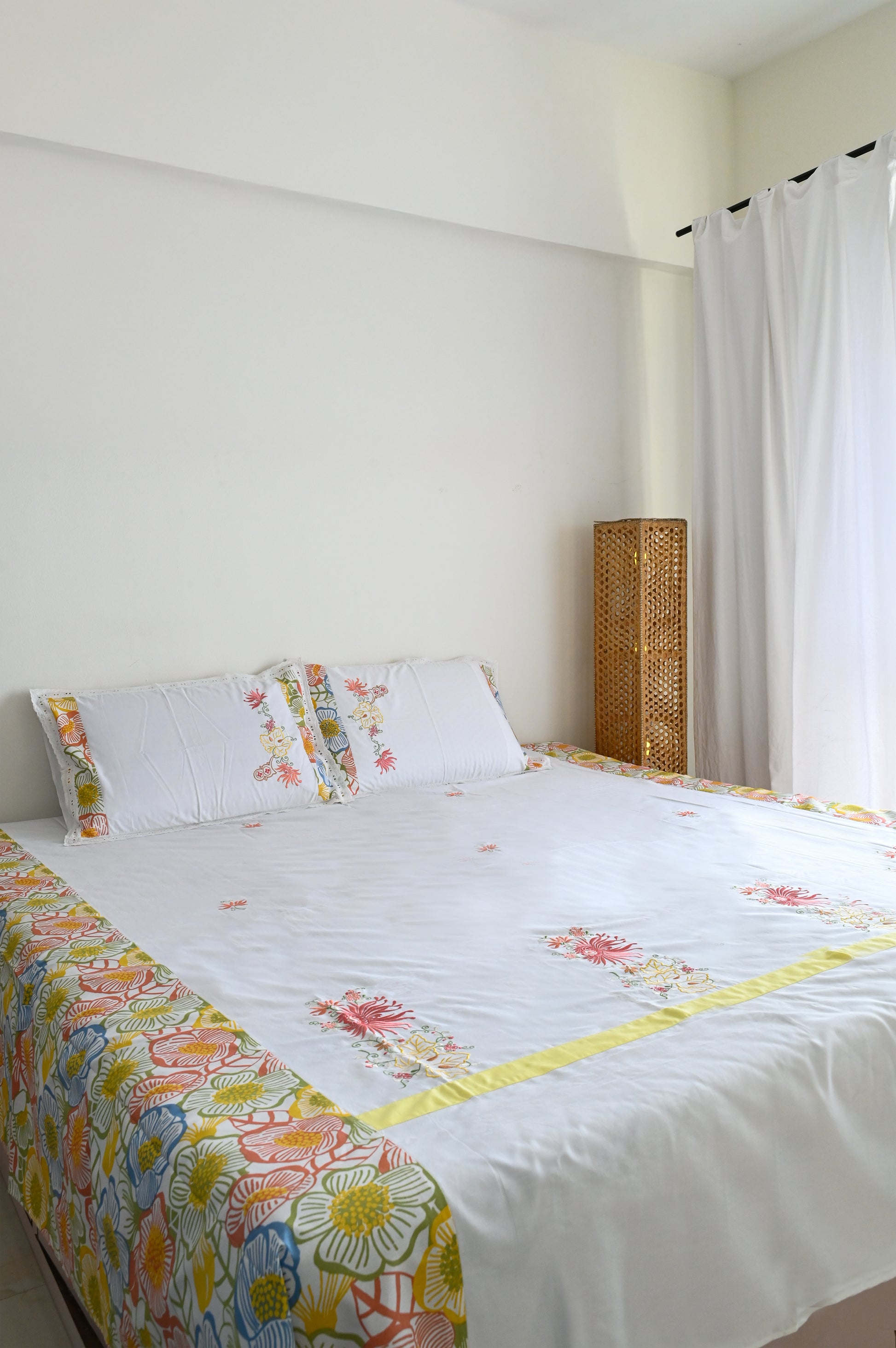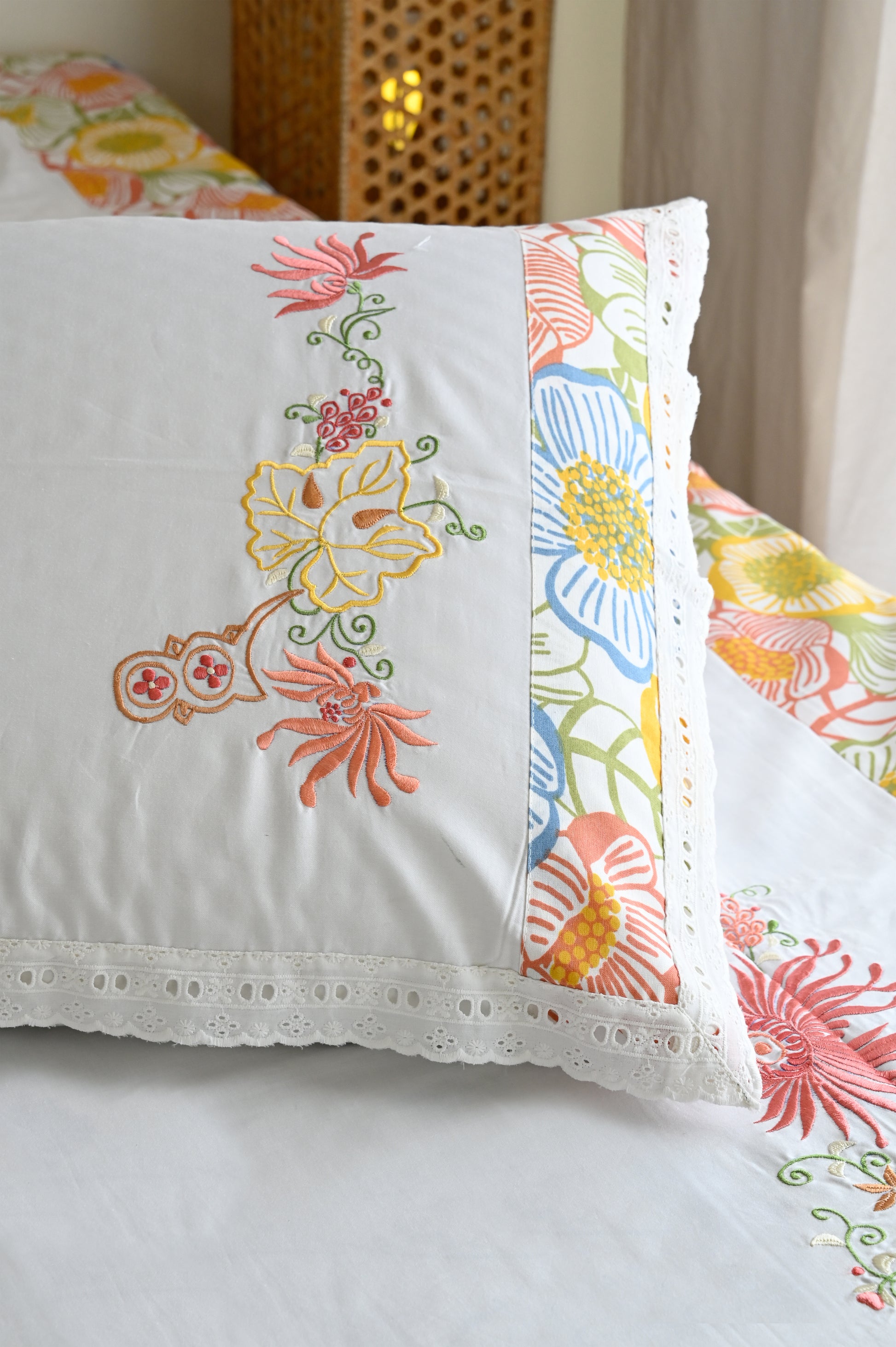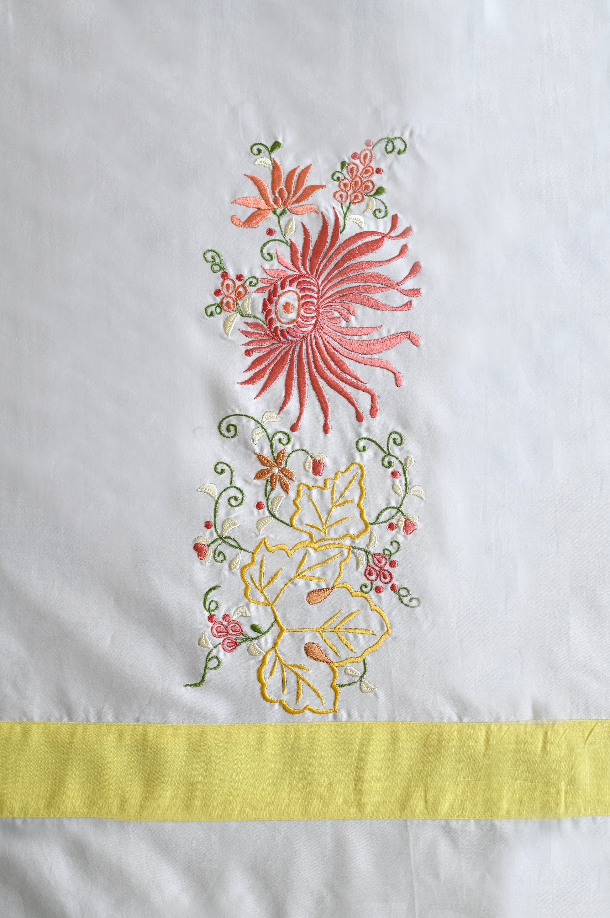 Bright florals cascade across a white background, framed by cheerful multicolored borders. Made with colorfast and durable fabric, it brings life to any room while maintaining its intricate floral detailing over time.