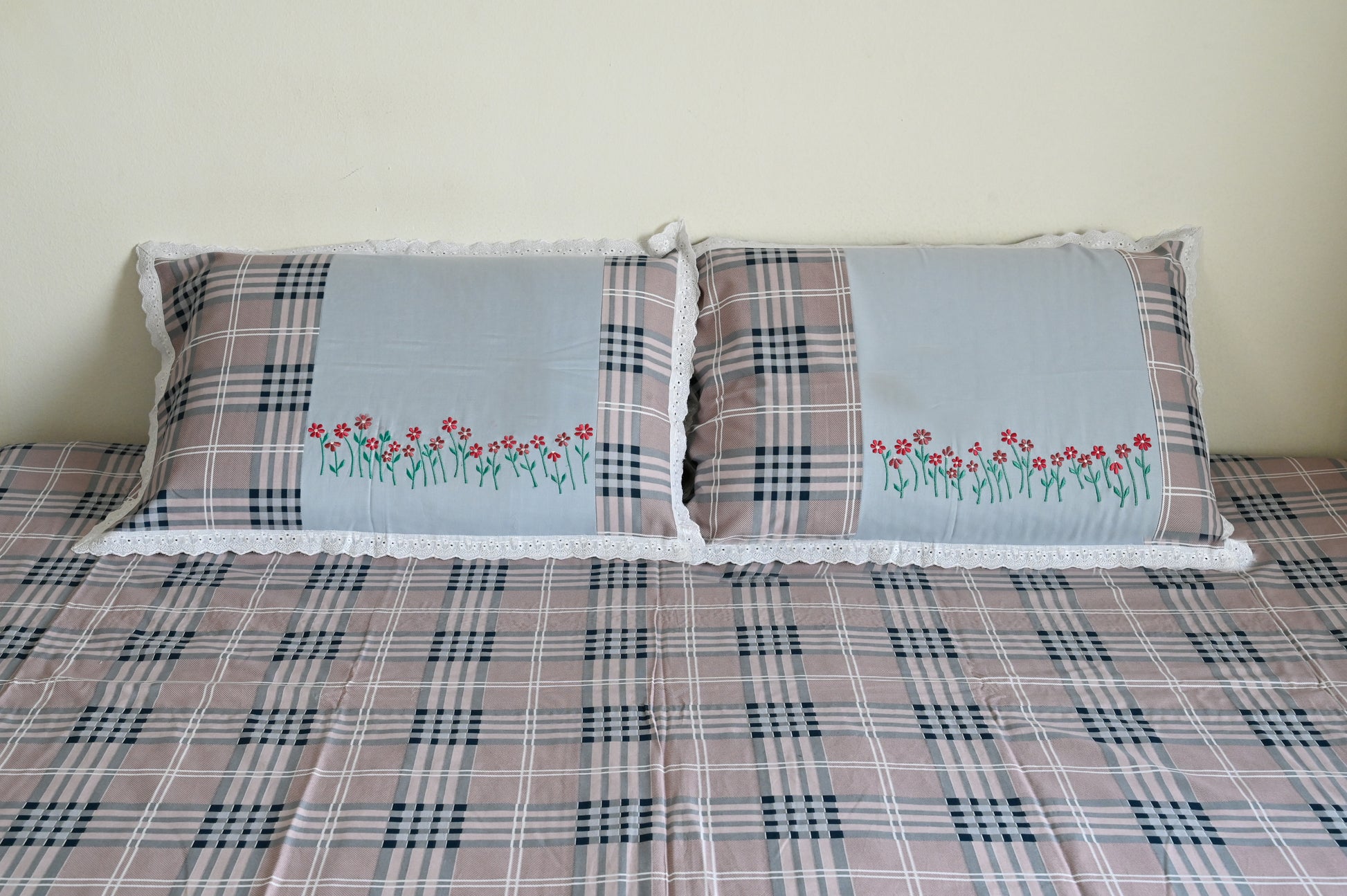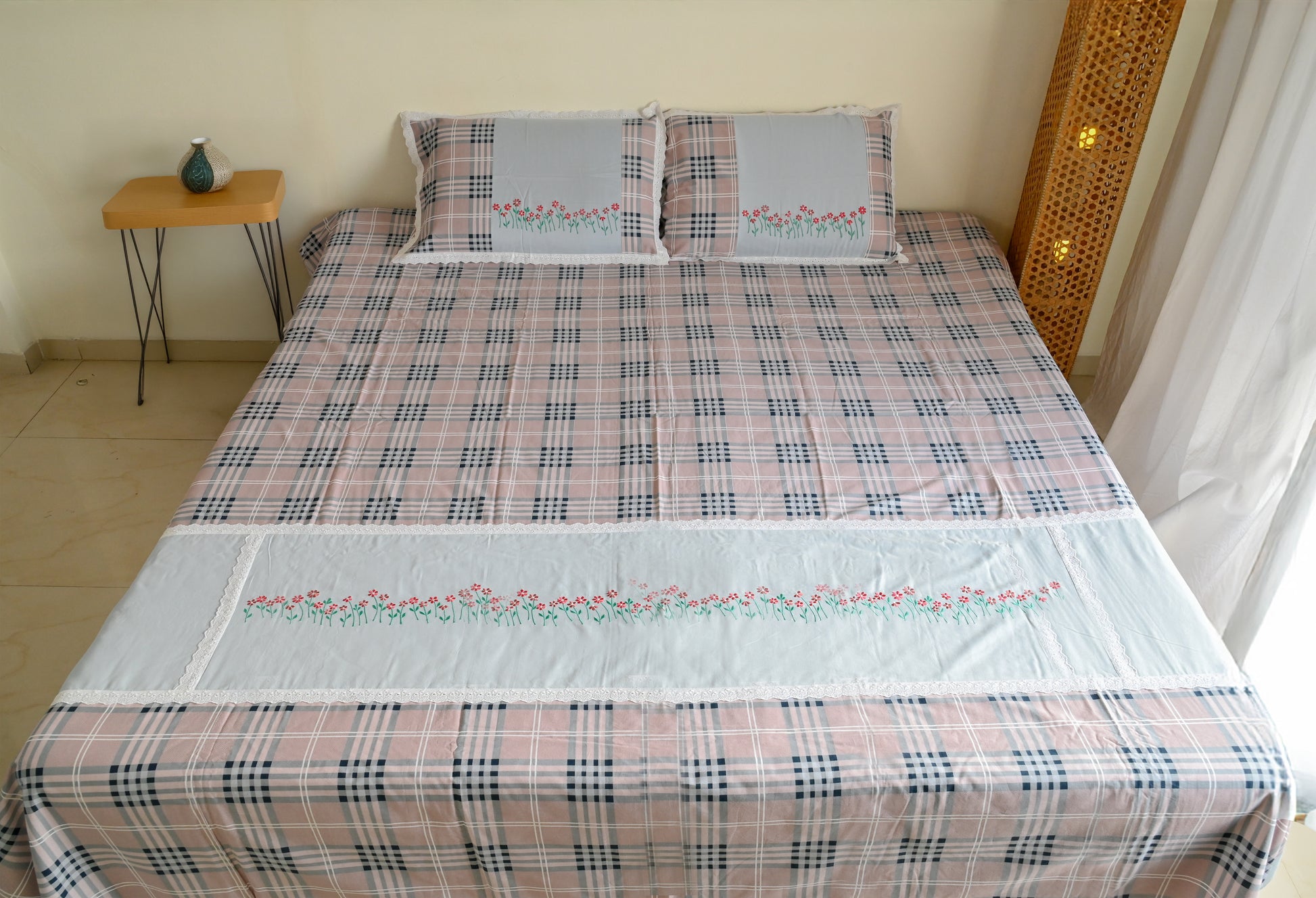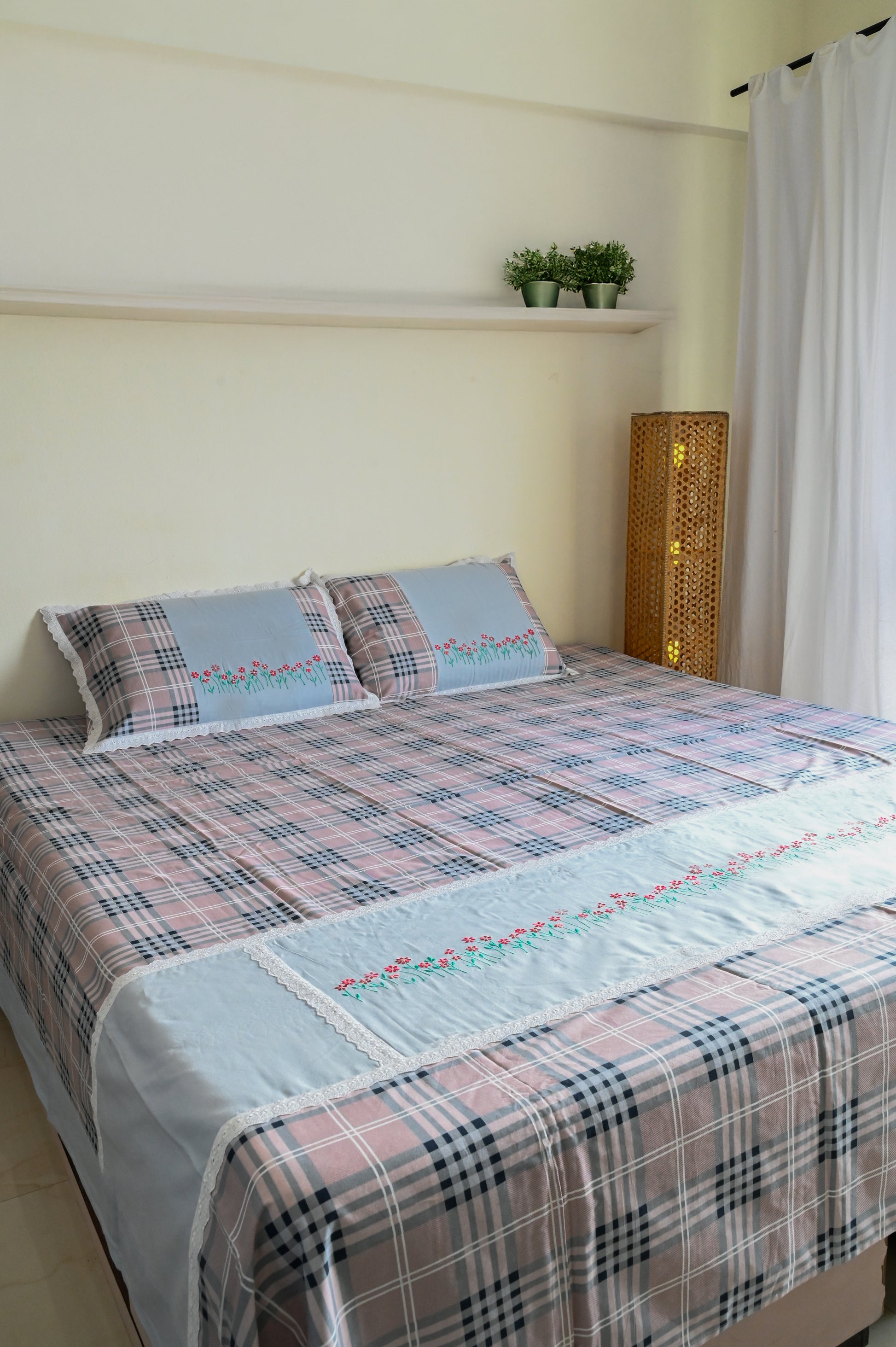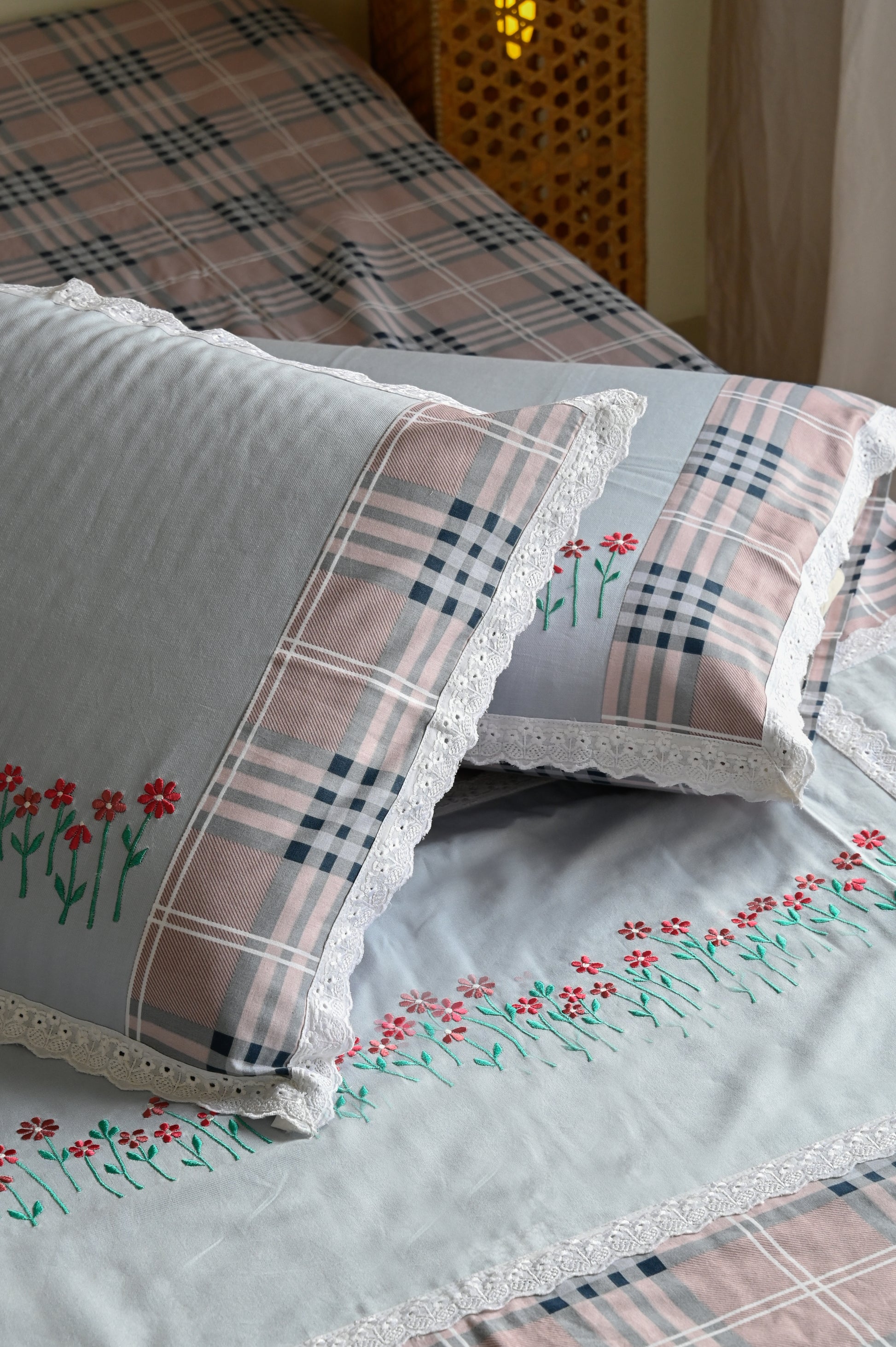 A checkered pattern of pink and gray dances with subtle symmetry. At its center, a white embroidered panel draws the eye, while the pillowcases quietly harmonize the contemporary design.