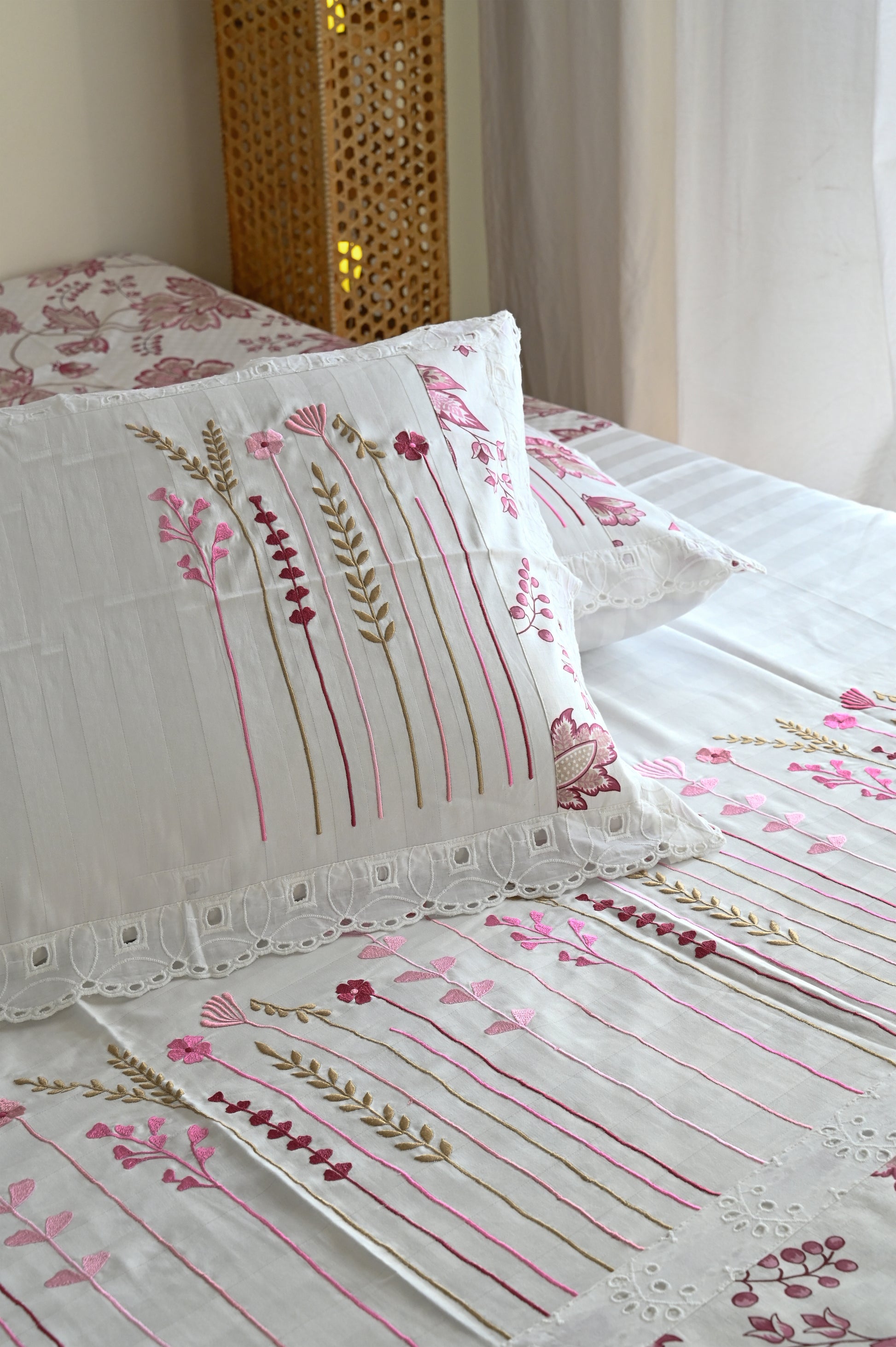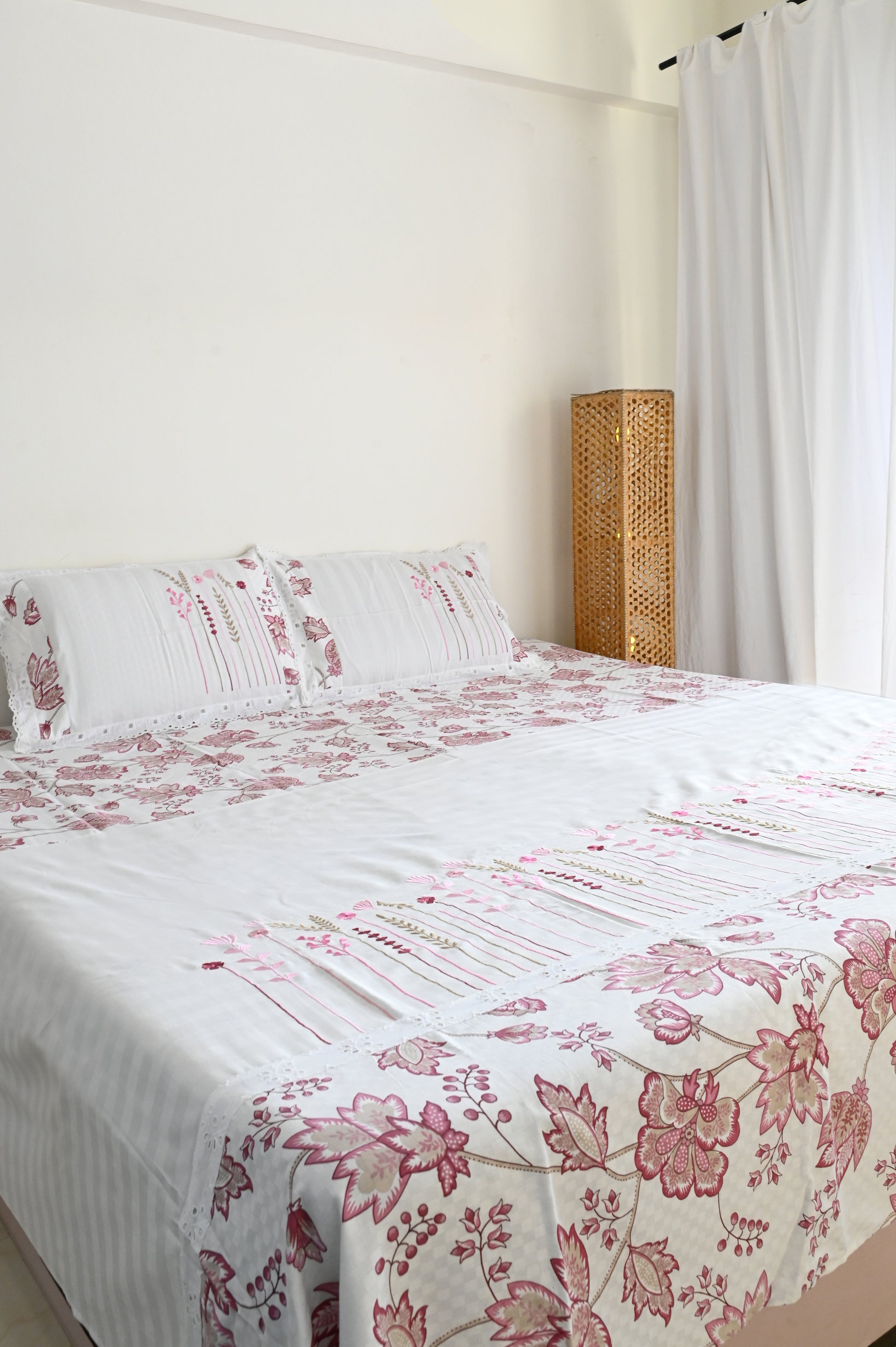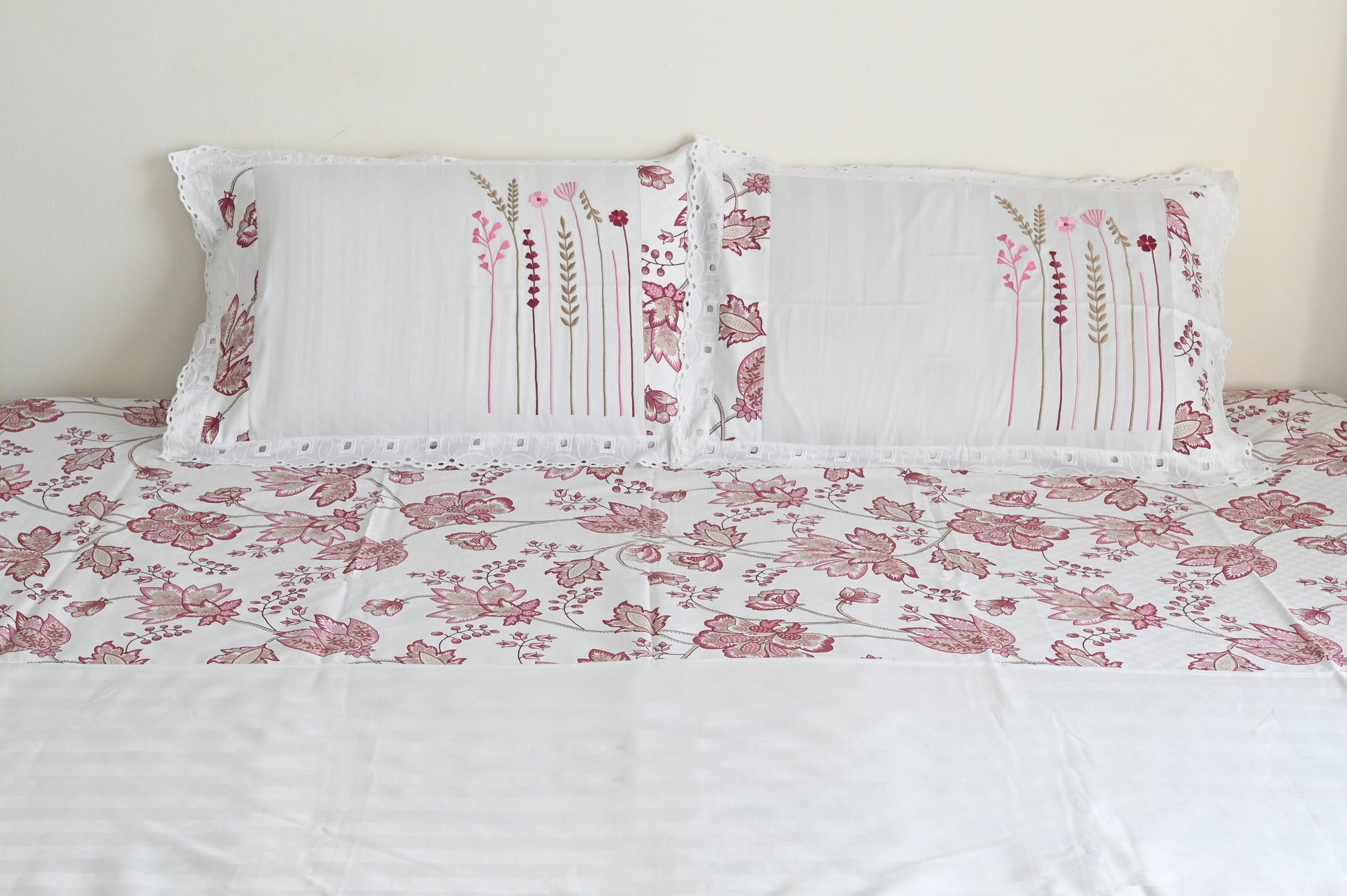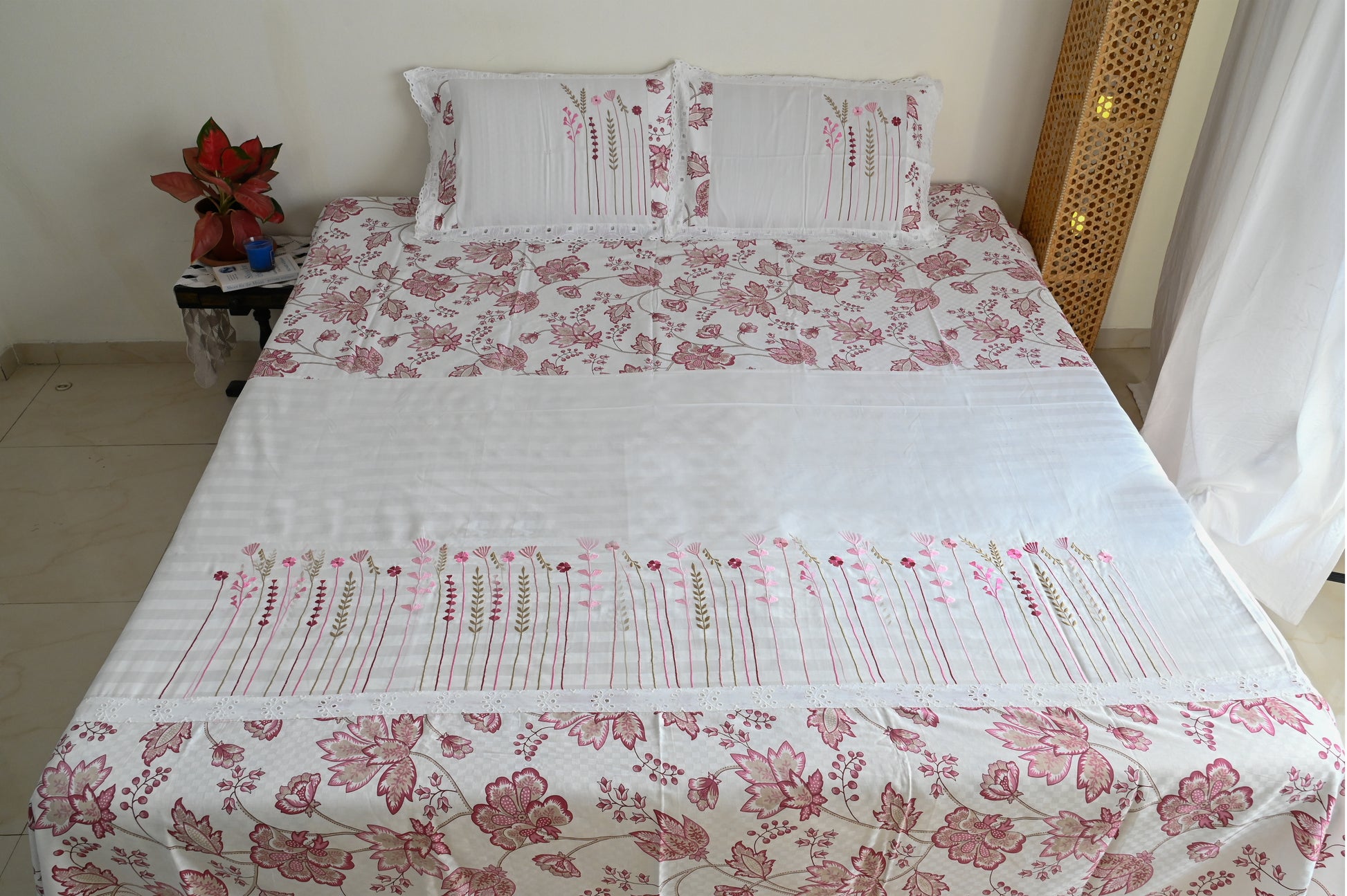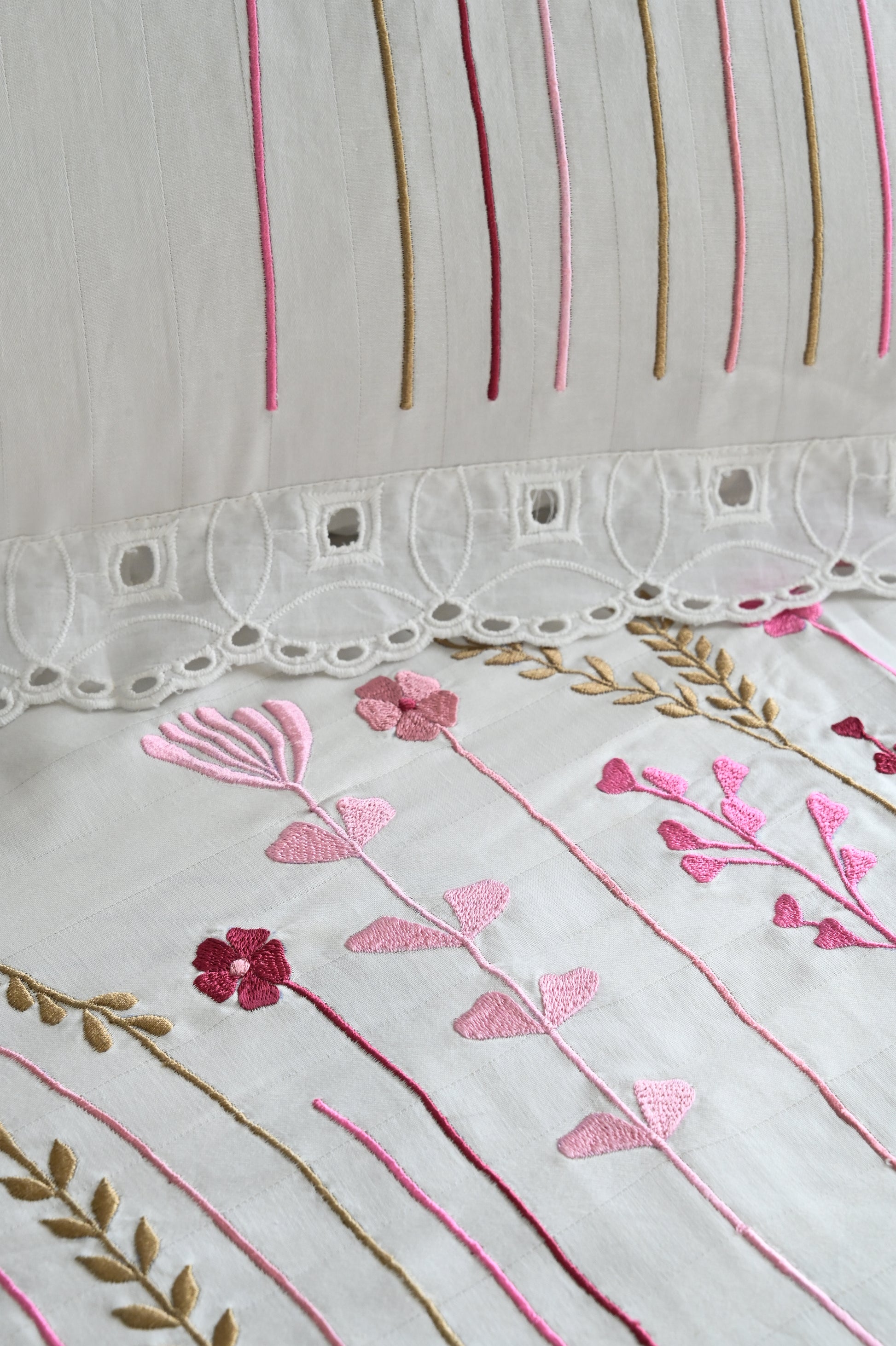 A mix of intricate pink patterns dances across the white fabric, creating a perfect blend of softness and vibrance. Designed with no thread plucking and long-lasting material, it combines elegance with effortless care.