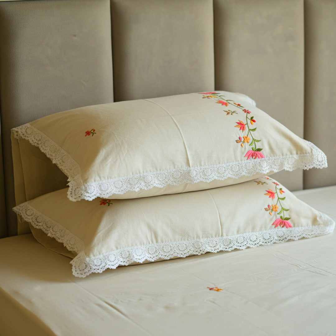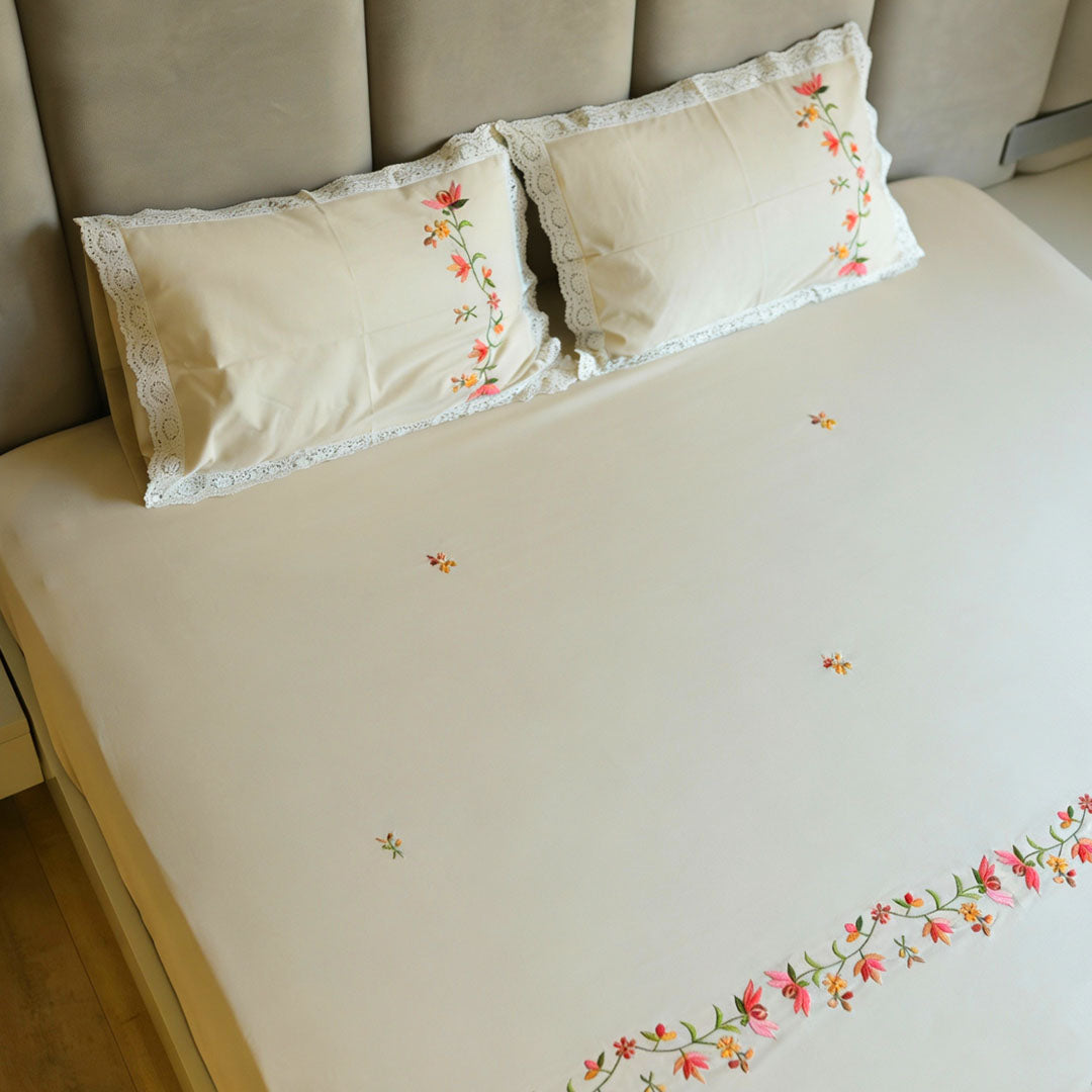 Soft, graceful, and timeless, Sunlit Fleur is an elegantly crafted bedsheet set designed to bring gentle warmth to the bedroom. Set on a serene butter yellow base, the design features delicate floral embroidery in soft blush and fresh green tones, arranged as scattered accents and a refined garland border that adds subtle movement and charm. The fine craftsmanship lends a handcrafted feel while keeping the look light and effortlessly refined.