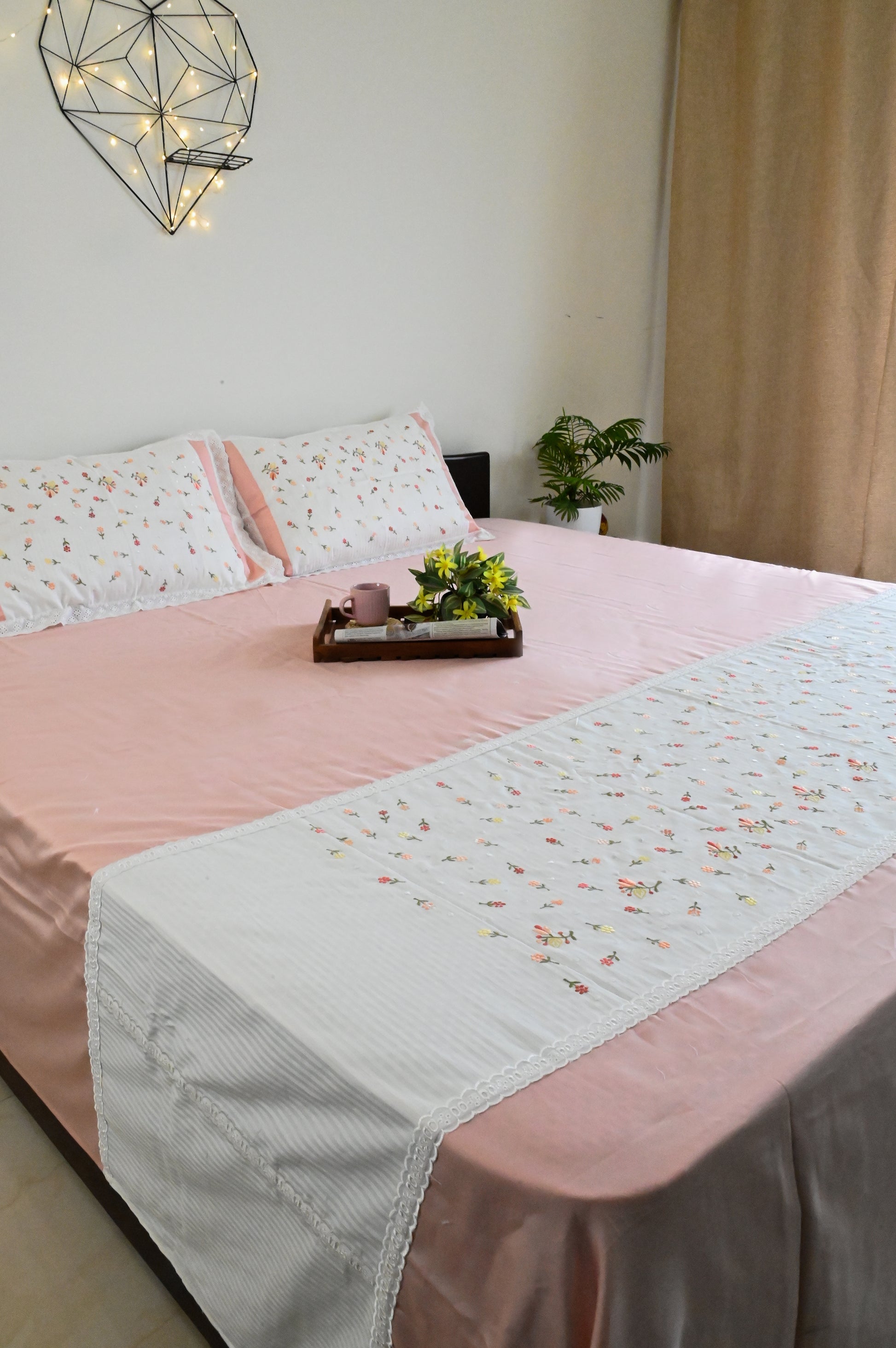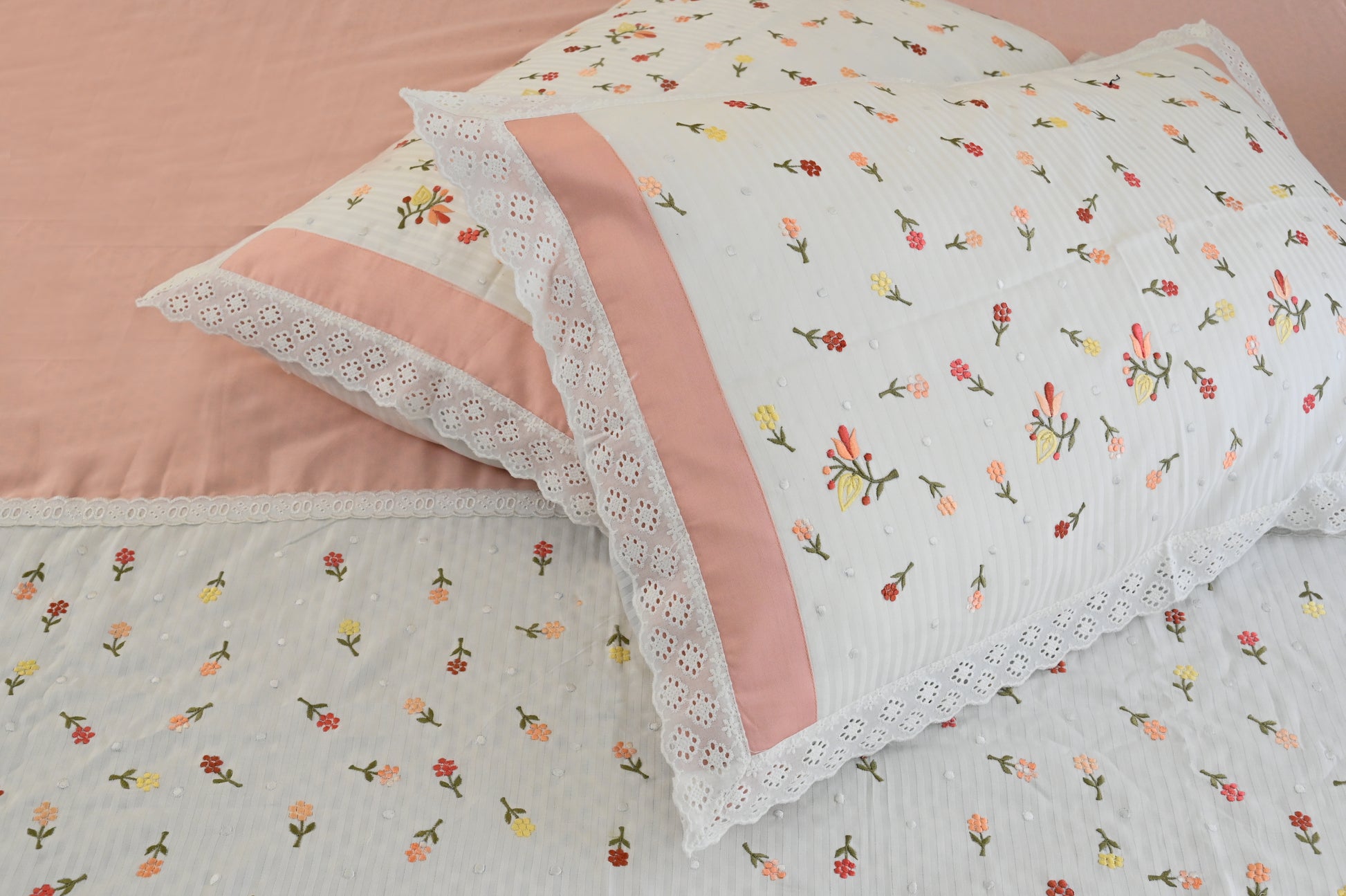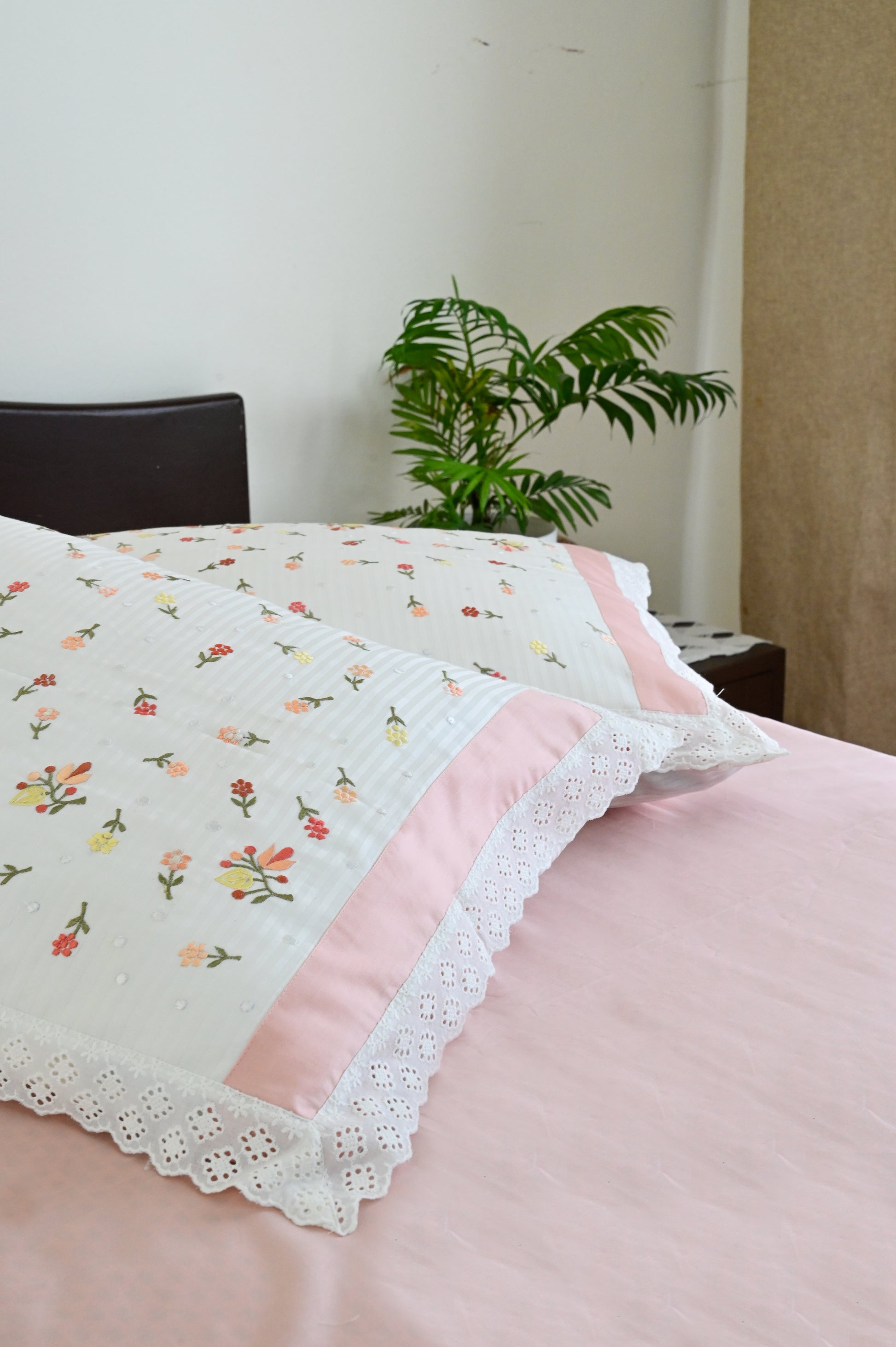 A pastel pink backdrop unfolds, with a white embroidered panel weaving softness into its heart. The floral accents on the pillowcases whisper of calm, crafting a haven of serenity.